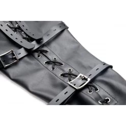 Met deze Full Sleeve Armbinder wordt bewegen onmogelijk. Het zwarte harnas bindt de armen ver achter op de rug waardoor de drager ze absoluut niet kan bewegen. De binder wordt over de schouders bevestigd en is volledig verstelbaar. De gespen zijn voorzien van een kleine ronde openingen waardoor er een slotje doorheen kan. Dit geeft de ultieme controle. Onderaan de binder is een sterke D-ring bevestigd waar je je favoriete bondage touwen en kettingen aan kunt bevestigen.