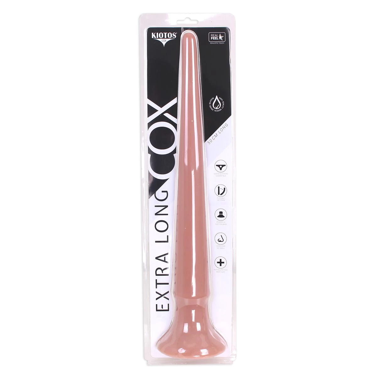 De Kiotos COX kan gebruikt worden met alle glijmiddelen op water- en siliconenbasis, is waterdicht, 100% ftalaatvrij, geurvrij en lichaamsveilig. Deze Kiotos COX dildo wordt verkocht in een blisterverpakking.