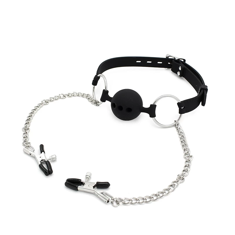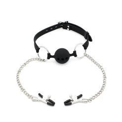 Het is mogelijk om door deze mondknevel te ademen dankzij de gaten in de ball gag. De gag is verstelbaar door middel van de siliconen band en sluit met een standaard rolgesp. Aan de mondknevel zijn twee verstelbare tepelklemmen bevestigd. Beide uiteinden van de tepelklemmen zijn gecoat voor comfort en veiligheid.