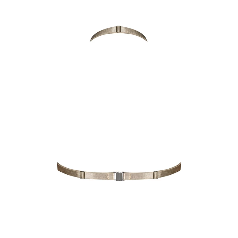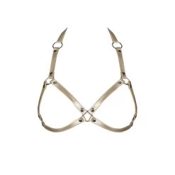 Luxe harnas A765 Harnas van goudkleurig kunstleer met verstelmogelijkheden en open cups. De bandjes zijn verbonden met metalen ringen, glanzende klinknagels zorgen voor een verleidelijk accent. Zacht en huidvriendelijk materiaal. De afgebeelde “A764 Jarretellegordel goud” is niet bij de levering inbegrepen en is apart verkrijgbaar.