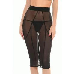 Schitterende zeer vrouwelijke rok met lijnenspel en zeer sexy met zijn transparante zwarte mesh-stof. Hoog getailleerde snit met een verlengbare zwarte ondoorzichtige riem die sluit met haakjes op de rug. De ondoorzichtige verticale lijnen bieden een mooi ontwerp aan de rok en verlengen het silhouet. Aan de achterkant heeft het een rits die naar beide kanten op en neer gaat. Je kunt combineren met de top Diane of een mooie lingerieset (zie totale look).