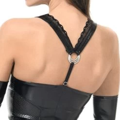 De Iris Playsuit is een korte Playsuit die bestaat uit een mooie mix van materialen in een zeer vrouwelijk en sensueel ontwerp. Zwart glanzend vinyl gemixt met een lederlook stof met kleine gaatjes en een prachtig kant op de halslijn en bandjes. De bandjes ontmoeten elkaar aan de achterkant in een metalen ring en een verstelbaar riempje. De playsuit heeft een rits die vanaf de borst tot aan bovenkant van de billen door loopt met twee schuiven te open is. Het wordt gepresenteerd met lange vinylhandschoenen (A01802).