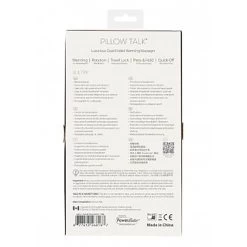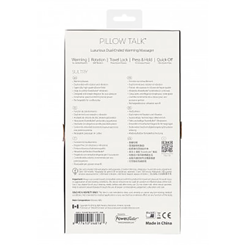Sultry by Pillow Talk heeft een gladde afgeronde kop en krachtige vibraties. Het heeft een taps toelopende instelbare hendel die 360 graden draait voor een ongelooflijke stimulatie van de G-spot. De draaiende as van Sultry biedt ook een premium opwarmfunctie voor extra comfort en realisme. Belangrijkste kenmerken: twee onafhankelijke motoren: trilling en rotatie Dazzles met Swarovski-kristal | Diepe en krachtige PowerBullet-vibraties | Ontworpen met eenvoudige elegantie voor uw plezier | Opwarmschacht voor extra realisme | Roterende schacht met 360 graden beweging | Oplaadbaar voor draadloos spelen Flexibele nek | Looptijd: tot 1,5 uur | Oplaadtijd: 2,5 uur | Een speciale witte borstel met kleine borstel is opgenomen in de doos voor het effectief reinigen van de groeven van dit seksspeeltje.