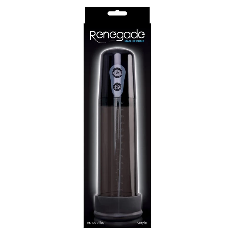 De Renegade Man Up Penispomp is een op batterijen aangedreven penispomp die is ontworpen om hem harder dan ooit tevoren te krijgen. Het superieure ontwerp wordt aangedreven door een stille motor, die maximale automatische zuigkracht biedt voor langdurige prestaties. Hij beschikt ook over een meetliniaal op de pomp, zodat de gebruiker zijn voortgang kan volgen. Het ontwerp heeft een 22 cm (9 inch) lange industriΓ«le pompcilinder van acryl, wordt geleverd met een zachte TPE sleeve voor extra comfort tijdens gebruik.