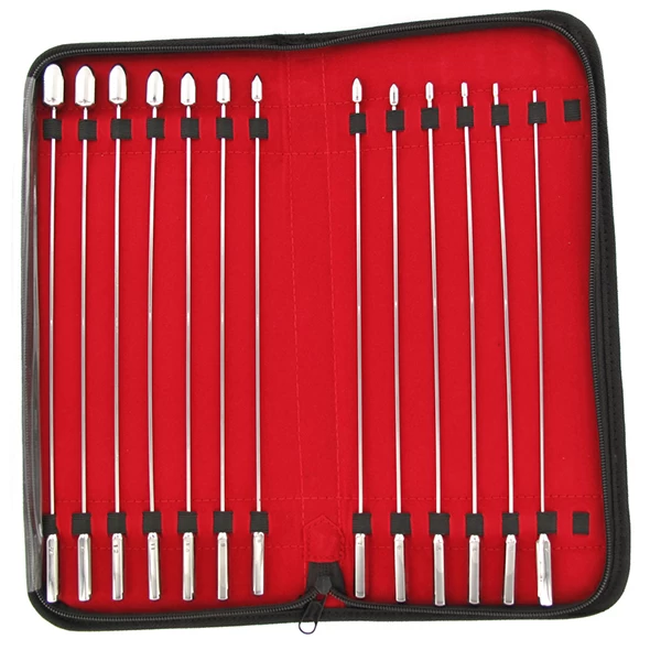 Dilatorset waarin 13 dilators zitten van het type Rosebud Urethral. De diators zitten in een praktische en mooie zwartleren opberghoes. De sounds oftewel dilators zijn natuurlijk van medische kwaliteit en gemaakt van chirurgisch metaal. De dilators rosebuds zijn ongeveer 30 cm lang en hebben een breedte variërend van 4 mm t/m 12 mm met een lengte van de kop varierend van 10 t/m 25 mm.